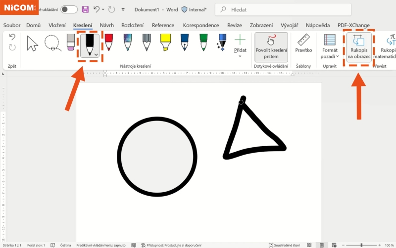 Klikněte na kartě Kreslení na tlačítko Rukopis na obrazec.